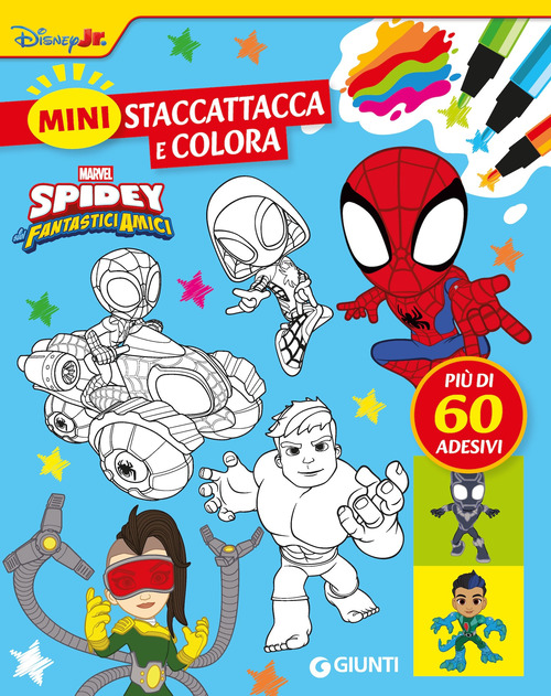 Libro della nuova collana Mini Staccattacca e colora, nata dal successo costante di Staccattacca&Colora Disney. Il libricino in versione pocket contiene 16 pagine in bianco e nero, da colorare, e 2 fogli di adesivi a colori, più di 60, da utilizzare a piacimento. È possibile attaccare l'adesivo sulla pagina corrispondente per colorare i personaggi di Spidey e i suoi fantastici amici. Età di lettura: da 3 anni.